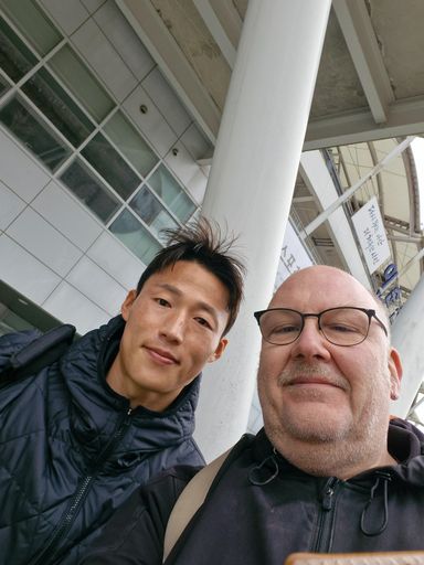 Etwa 30 Minuten nach dem ersten Spieler kam schließlich jemand genau aus dem Ausgang, der zwischen den beiden Fahrzeugen lag – er stellte sich als Han Kyo-won heraus. Er war ausgesprochen freundlich, unterschrieb gerne und unterhielt sich kurz mit mir. Tatsächlich stieg er auch in das mir gezeigte Auto ein, was mein Vertrauen in die Aussage des Betreuers weiter stärkte.
